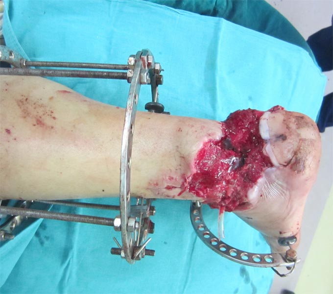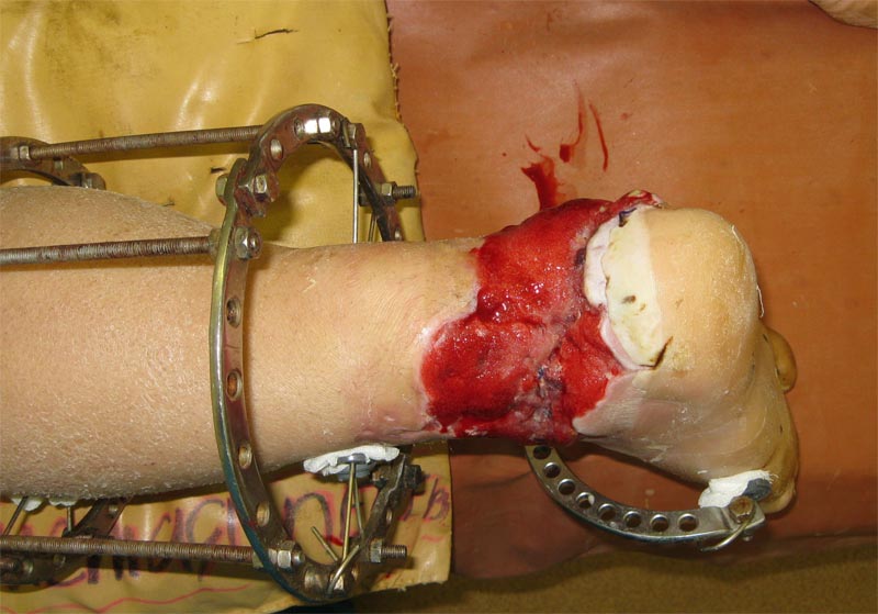 Пациенту для закрытия дефекта выполнена резекция таранной кости, пяточно-большебецовый артродез винтами. После укорочения сформировался запас тканей, достаточный для закрытия дефекта. Далее несколько дней повязка с низким давлением и свободная аутодермопластика. Пациент выписан. После окончательного заживления планируем демонтировать аппарат и перейти на циркулярную повязку. Когда по Вашему мнению следует давать нагрузку?