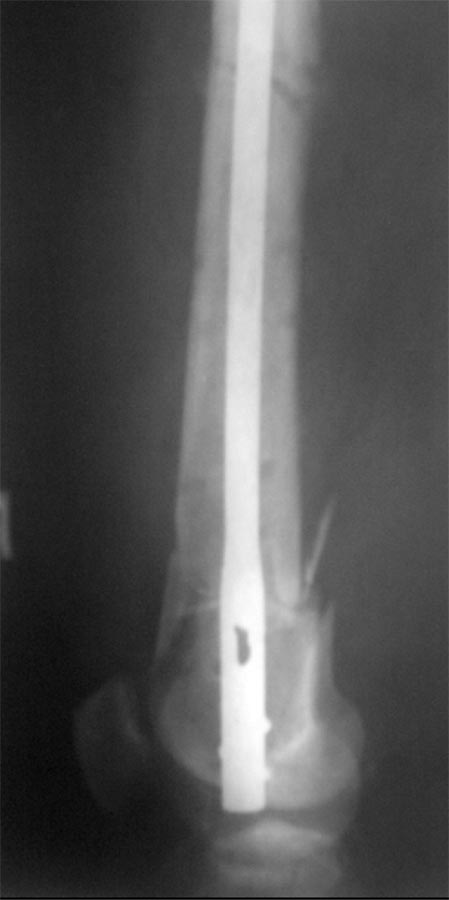 Существуют этапные снимки, по которым можно оценить ось бедра во фронтальной плоскости- она правильная, нарушена ось промежуточного фрагмента. Насчет выстояния конца гвоздя- сам об этом думаю, но опасаюсь, что при переблокировании развалится дистальный отломок (он уже и так как дуршлаг). Хотелось бы услышать мнение уважаемого Александра Николаевича Челнокова.
