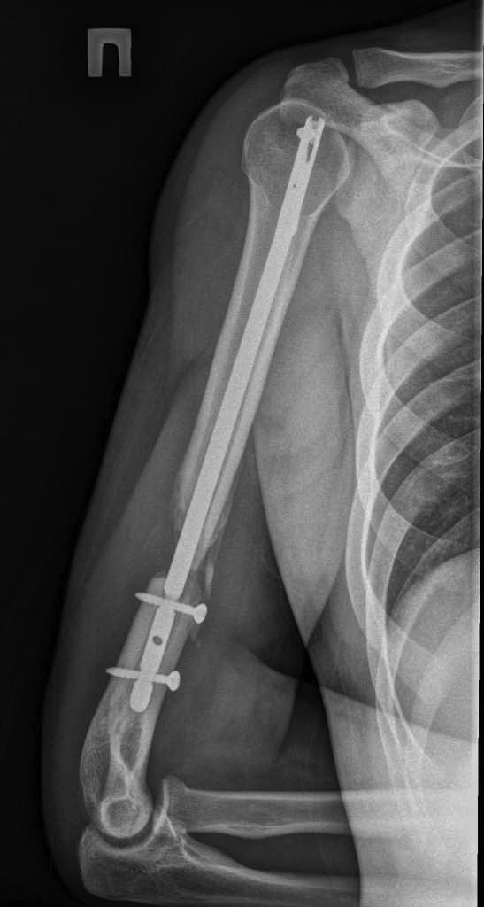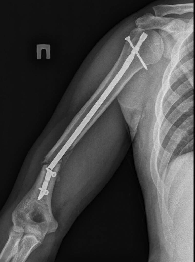 Пациент 25 лет, в сентябре 2012 г ДТП. Кроме всего прочего, открытый перелом правого плеча с дефектом костной ткани. При поступлении выполнено ПХО и ЧКО из 2 колец. После заживления раны выполнен БИОС плеча. Штифт сОлидный, Остеомед. Пару дней назад во время попытки открытия крышки банки (нагрузка по ротации) почувствовал боль в плече. Результат на снимке. Планируем удалить оба отломка (дистальный открыто) и перештифтовать более массивным штифтом. Вопрос №1: есть ли вариант в данном случае закрыто удалить дистальный франгмент НЕканюлированного штифта. Особых инструментов для удаления сломаных штифтов не имеем. Вопрос №2: как вариант рассматриваем выполнить ЧКО удалив предварительно только проксимальный фрагмент штифта. СтОит ли? Вариант накостного остеосинтеза с пластикой и без не рассматриваем. Спасибо за внимание.