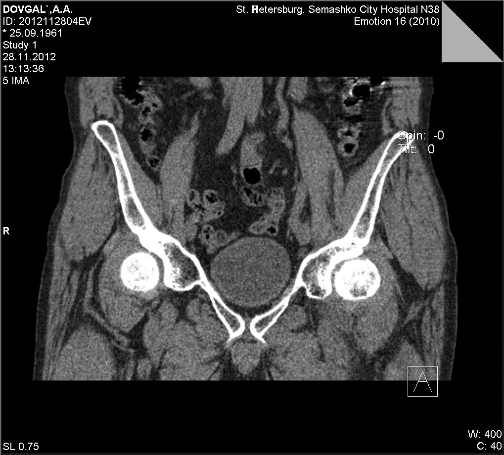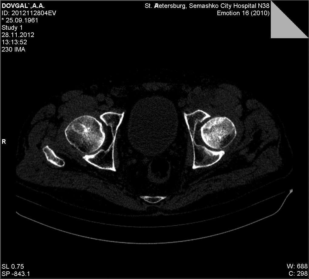 Доброго времени суток. Предлагаю к обсуждению случай с пациентом 51 года с переломом в передне-верхней зоне головки бедренной кости. С2.2 Мужчина, 51, направлен из травмпункта в наше ЛПУ с диагнозом " ушиб левого тазобедренного сустава". Со слов пострадавшего - 2 недели до поступления поскользнулся,упал с упором на левое колено. После чего появились боли в области левого тазобдренного сустава, боль при ходьбе, хромота, боль по передней поверхности тазобедренного сустава и в паху, боль усиливалась при осевой нагрузке, беспокоила в положении на спине, и на пострадавшем боку. Боль купировалась при сгибании в тазобедренном и коленном суставе в положении на спине. На стандартных рентгенограммах тазобедренного сустава патологии не выявлено.Госпитализирован в отделение с подозоением на импрессионный перелом головки бедренной кости Выполена компьютерная томография левого тазобедренного сустава, выявлено повреждение головки бедренной кости со вдавлением по передне-верхеней поверхности. На данный момент больному рекомендована разгрузка, ходьба без опоры на костылях до туалета, в остальном постельный режим. На обсуждение выносится ваш взгляд на дальнейшую тактику ведения больного, ваши наблюдения и предложения.В отделении мы рассматриваем следующие варианты: 1. Консервативное лечение с длительной разгрузкой, приемом хондропротекторов, сосудистых препаратов и т.д. 2. Возможность проведения ротационной остеотомии( есть небольшой опыт)