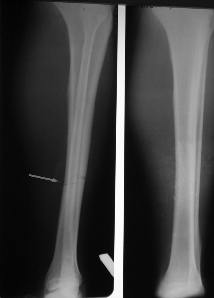 В данном случае изолированный поперечный перелом большеберцовой без вовлечения малоберцовой. Проверка на деформацию и на крепитацию очень плохая идея!