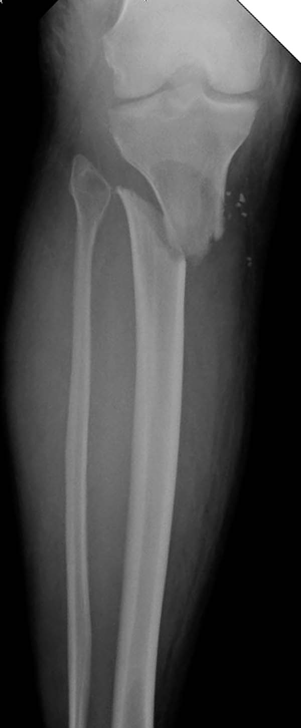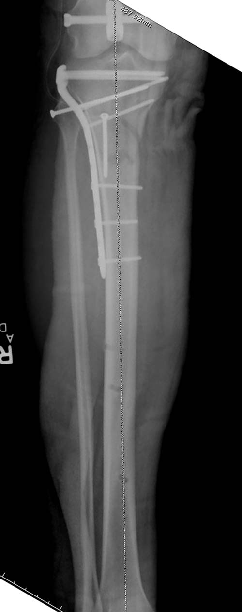 Здесь, кроме перелома верхней трети голени, имеется вовлечение сустава, и, чтобы не пропустить смещение суставной поверхности, надо делать КТ. Срезы КТ покажут о необходимости субхондральной фиксации, которая проводится 3.5 мм параллельными шурупами (Raft technique). Не имеет значения, как проводить: отдельно субхондрально или через верхний ряд пластины. Главная задача фиксации удержать суставную поверхность от коллапса в вальгус или варус.