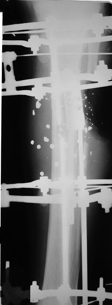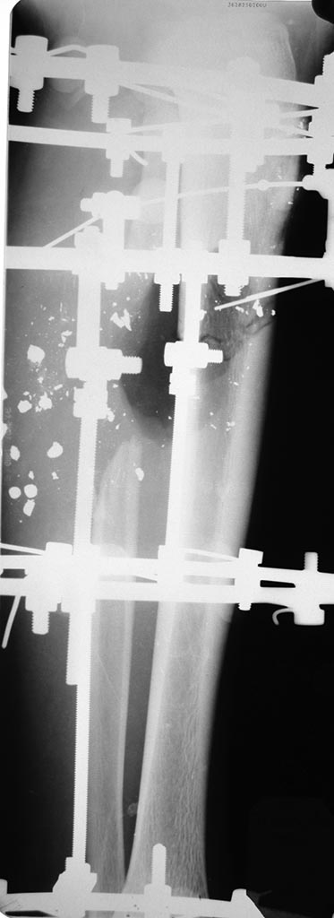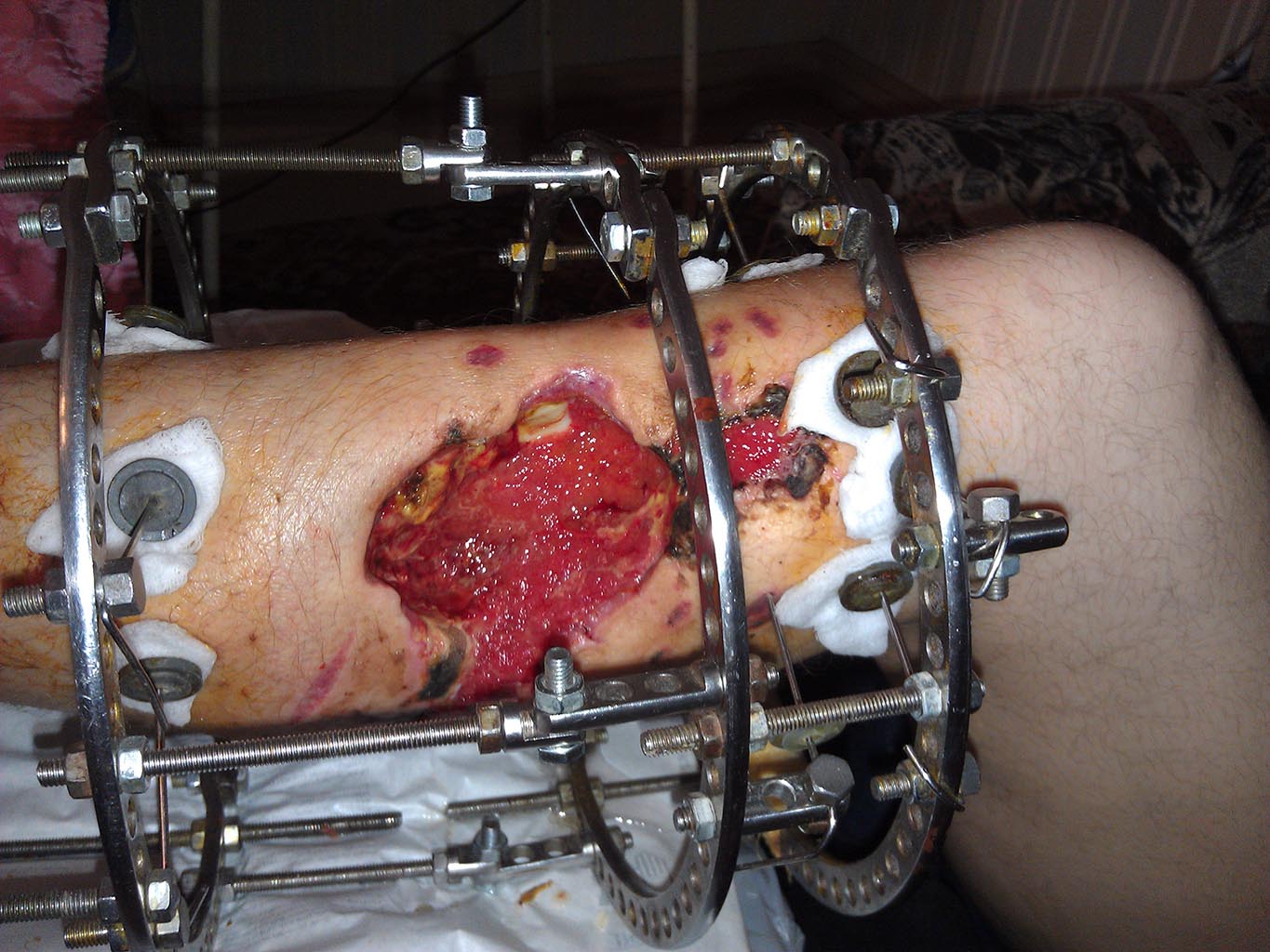 Как видно на представленных фото, дефект располагается на границе верхней и средней трети голени, зоне не самой неблагоприятной для закрытия. Если сохранен солеус, то закрытие кости необходимо было выполнить в течение первых 7-10 сут. Фиксация перелома в зависимости от имеющихся возможностей. У нас выполнили бы БИОС, рассмотрев вариант с нанесением АБ покрытия.