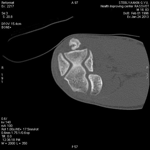 Уважаемый Андрей. А можно увидеть обычную рентгенограмму локтевого сустава в 2-х проекциях и посмотреть, а где проекционно то, что Вы обозначаете, как свободный фрагмент?