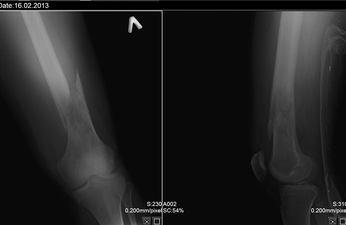 нужна биопсия. Биопсию должен делать онкоортопед, который будет в последующем проводить возможную радикальную резекцию и эндопротезирование, или хотя бы кто-нибудь, знающий технику операции ( чтоб при радикальном вмешательстве иссечь биопсийный рубец) и правила проведения биопсии. В идеале - во время биопсии замороженная секция и окраска по Граму.