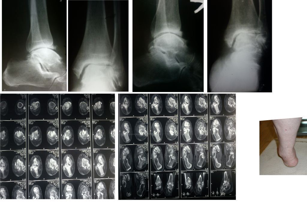 Уважаемые коллеги. Пациентка 1948 г.р., беспокоят боли в области левого голеностопа, прогрессирующая деформация(варусная) и неустойчивость сустава.Травму отрицает. Болеет более 5-ти лет. Согласна на операцию. Вопрос об артродезе г/ст сразу не вызывал сомнений. Но, если это артропатия, то насколько велик риск несращения? Помогите определиться с диагнозом и сответственно с тактикой. Невролог патологии не находит. Во вложенных файлах рентгенограммы за 2007 и 2012 гг.? фото и КТ свежая.
