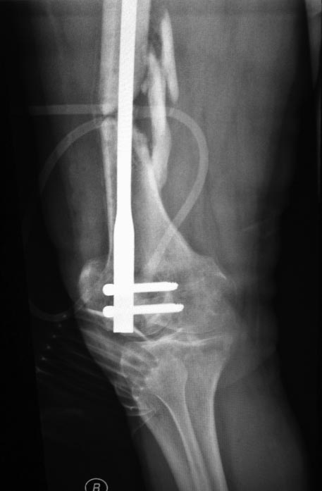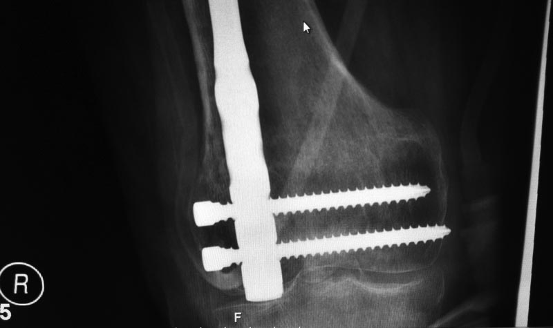 P.S. после такого синтеза суставу определенно кирдык. (Извините за жаргон, но через латеральный мыщелок ввести ретроградный гвоздь...) Здесь можно было и антеградно сделать, не "вскрывая" сустав.