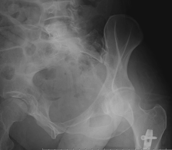 Перелом вертлужной впадины отличается от “переломов таза” не только исследованием, но также тактикой. По классификации Летурнеля расположение линии перелома характерно для поперечного перелома вертлужной впадины, но наличие шурупов в заднем крае (второй снимок) и вывих бедра подтверждают, что здесь сочетание заднего края с поперечным переломом.