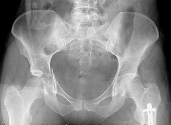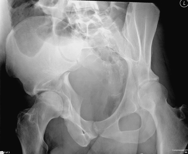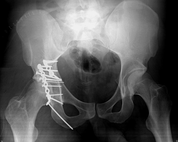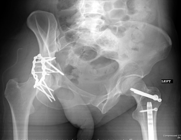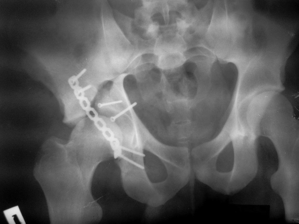 Перелом вертлужной впадины отличается от “переломов таза” не только исследованием, но также тактикой. По классификации Летурнеля расположение линии перелома характерно для поперечного перелома вертлужной впадины, но наличие шурупов в заднем крае (второй снимок) и вывих бедра подтверждают, что здесь сочетание заднего края с поперечным переломом.