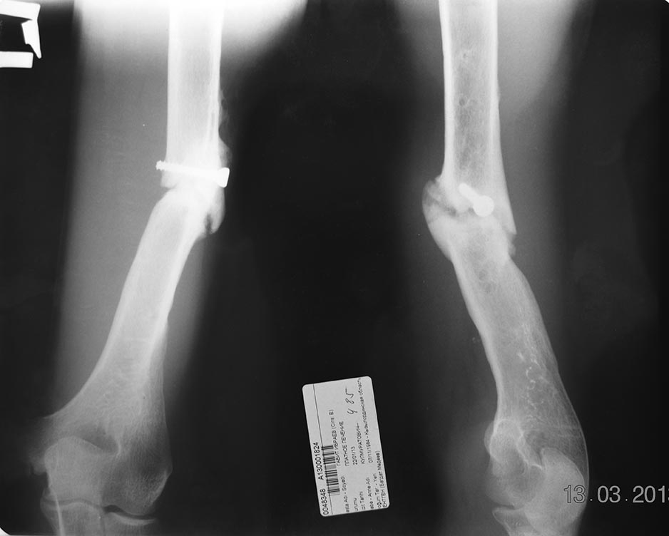 Произведена открытая репозиция, экстрамедуллярный некорректный металлоостеосинтез (фиксация 4 винтами). 2010 году в ОКБ по поводу ложного сустава и нестабильностью металлоконструкции произведено ЧКДО аппаратам Илизарова +костная аутопластика. В данный момент имеется угловая деформация плеча и незн болезненность в проекции деформации. Клинический признаки воспаления и потологический подвижность нет, но рентгенологический признаки слабой консолидации и угловой деформации.