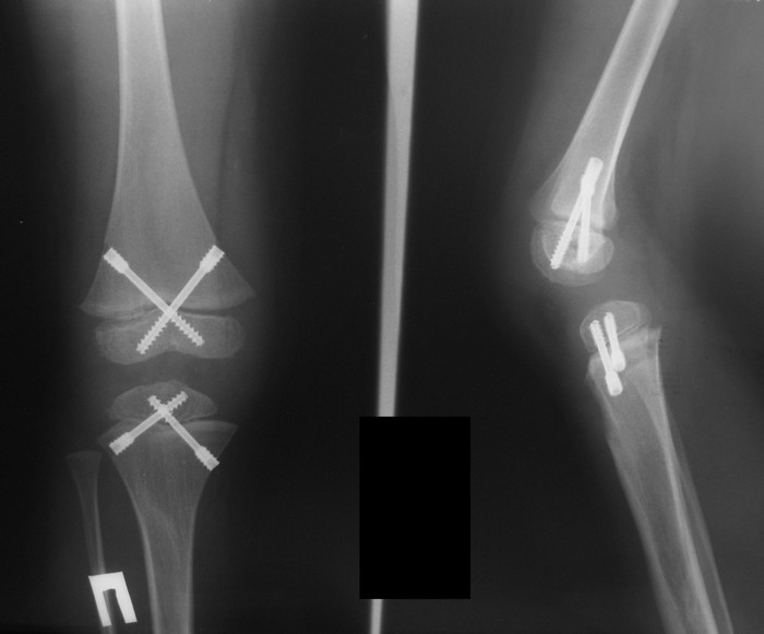 Действительно хорошая идея сделать именно ВРЕМЕННЫЙ эпифизеодез с применением 8-образных пластин, установленных с двух сторон на проксимальную зону роста большеберцовой кости. До 1,5 лет их можно оставить без последствий для ростковой зоны. Применение винтов для блокирования ростковой зоны приведет к её закрытию, за чем последует значительное укорочение сегмента в связи с малым возрастом ребенка.