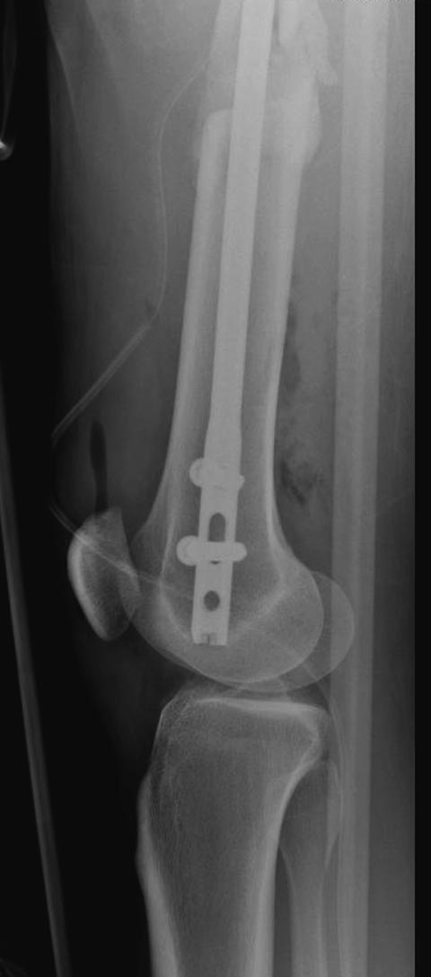 В фиксации тибиал плато надо соблюдать осторожность, потому что по снимку кажется поврежденной только медиальная часть, и медиальные переломы имеют тенденцию вовлечения задней поверхности плато. Боковой снимок покажет, куда идет линия перелома, а также покажет состояние перелома надколенника. Фиксировать надо buttress-опорной пластиной иначе винты не удержат варусный коллапс. В зависимости от вовлечения разгибательного механизма фиксация надколенника.
