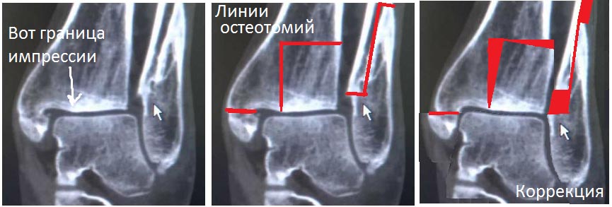 Я тут порисовал немножко, подвигал косточки, посмотрите. Это один из вариантов коррекции. Всё-таки в Вашем случае есть граница между импрессированной частью суставной фасетки и неповреждённой, так что можно одним движением и смоделировать суставную поверхность, и исправить вальгус. Красные линии - линии остеотомий, красные поля - зоны образующихся дефектов, на наружной лодыжке, я думаю, их можно не замещать, если сделать Z-образную удлиняющую остеотомию, достигается хорошая площадь контакта по зоне остеотомии. А вот дефекты в большеберцовой кости лучше чем-нибудь заполнить, аутокостью, аллокостью, биокомпозитами - по желанию. Укорочение малоберцовой кости значительное, для его устранения мы бы использовали дистрактор, аппарат на двух спицах. Фиксация большеберцовой кости - винты, если клиновидный дефект заполнен массивным трансплантатом, винтов, на мой взгляд, достаточно. Если есть сомнения в стабильности фиксации большеберцовой кости, поможет опорная пластина по передне-наружной поверхности. Малоберцовая кость - пластина по наружной поверхности. Внутренняя лодыжка - спицы с проволокой или винты. Вот как-то так...