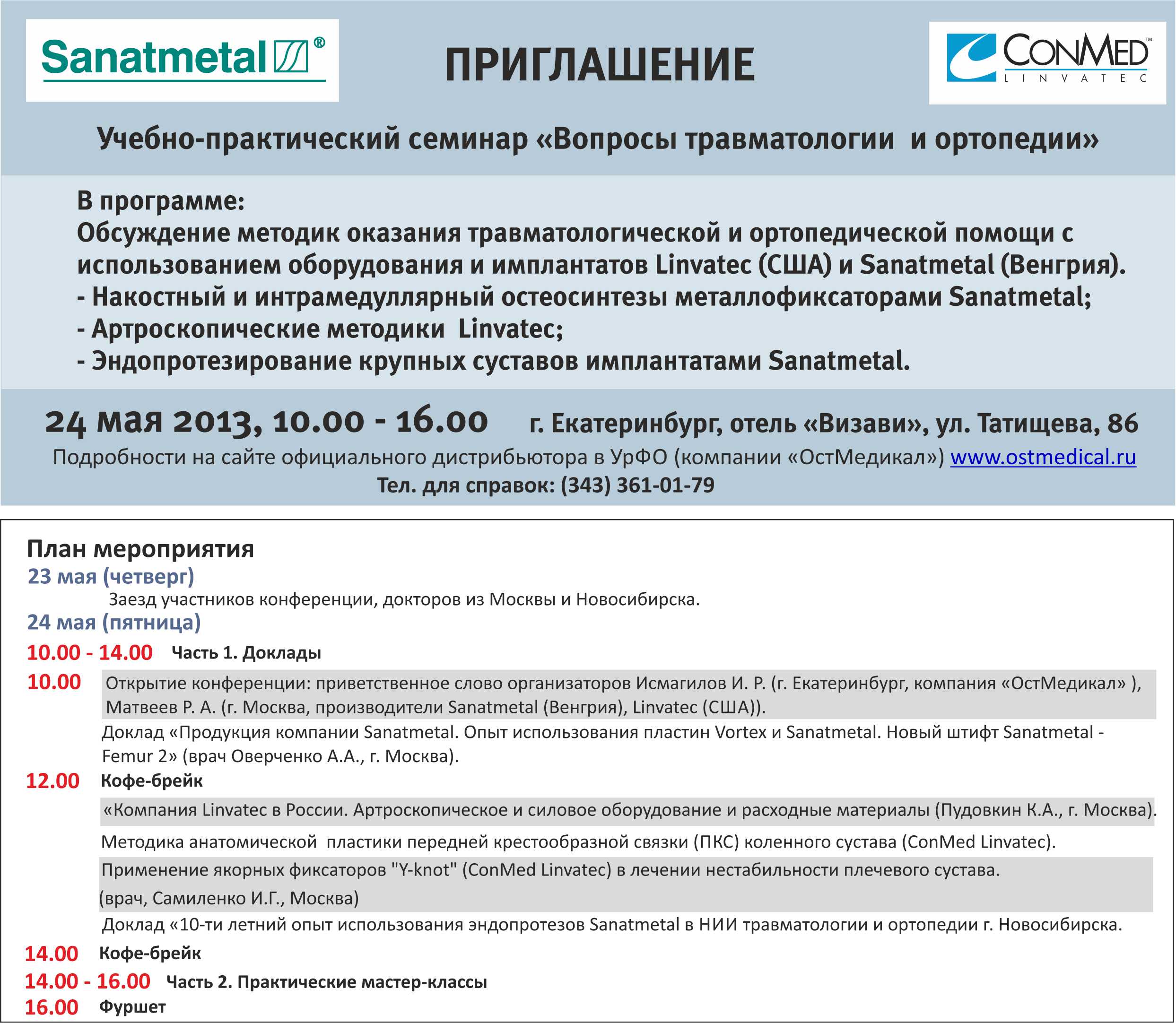 из Добрый день! Приглашаем принять участие в ежегодном семинаре "Вопросы травматологии и ортопедии", который состоится 24 мая в 10.00 в Екатеринбурге (приглашение во вложении). Организатор: компания "ОстМедикал" (г. Екатеринбург). Вопросы по тел: (343) 361-01-79, 219-21-28. В программе: обсуждение методик оказания травматологической и ортопедической помощи с использованием оборудования и имплантатов Linvatec (США) и Sanatmetal (Венгрия). Накостный и интрамедуллярный остеосинтезы металлофиксаторами Sanatmetal Артроскопические методики Linvatec Эндопротезирование крупных суставов имплантатами Sanatmetal. Предусмотрены мастер-классы с использованием оборудования. Перерывы на кофе-брейк и обед. Приглашены практикующие врачи из Москвы. Представители компаний-производителей. По итогам учебно-практического семинара будут вручены сертификаты об участии. Об участии сообщите, пожалуйста, до 17 мая 2013 г. Будем рады Вас видеть! С уважением, Неустроева Дарья ООО «ОстМедикал»
