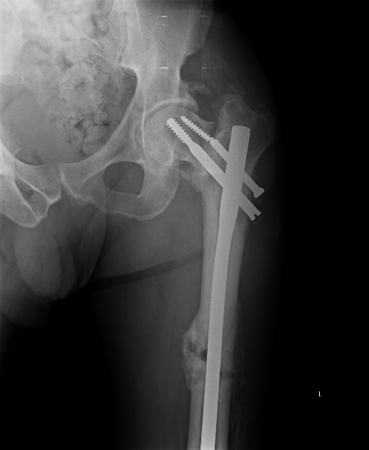 Реостеосинтез проксимальным гвоздем тут проблематичен, надо исхитриться сделать то, что не сделали при первичном остеосинтезе, т.е. вальгусную репозицию, восстановить длину бедра, и винт ввести не в имеющийся канал, а кпереди, и буквально субхондрально.