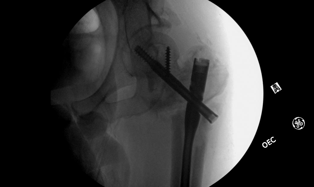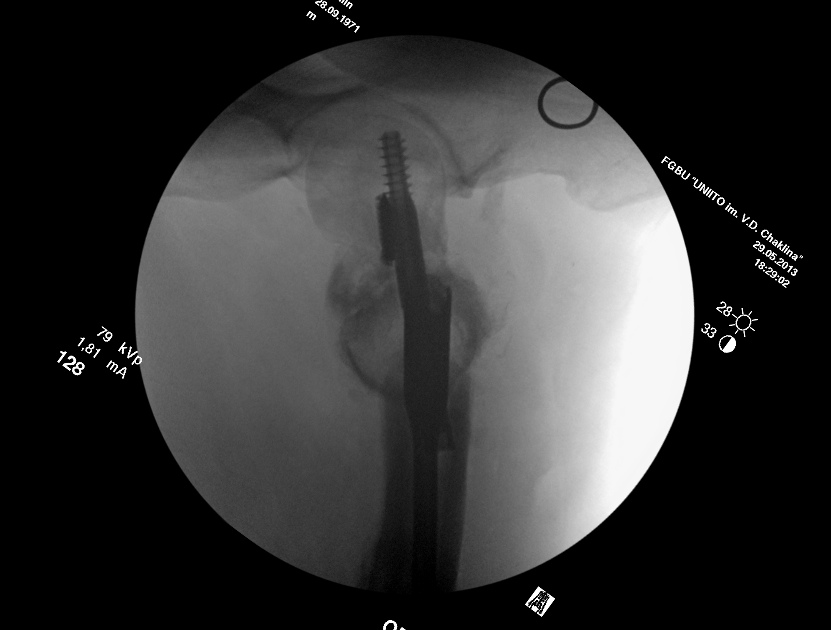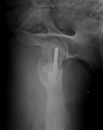 Пациент 63 года мужчина, остеосинтез чрезвертельного перелома проксимальным бедренным стержнем в октябре 2012. Постепенно появились и усилилиь боли в т.б.с., рентгенограммы показывают прорезание шеечного винта.