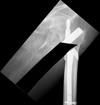 По сравнению с руглыми винтами плоская поверхность клинка имеет меньший шанс прорезывания, и поэтому в реконструкционной хирургии возле головки, предпочтительным фиксатором является Blade plate. Мы бы применили вальгусную остеотомию и фиксацию 120 градусным Blade plate.