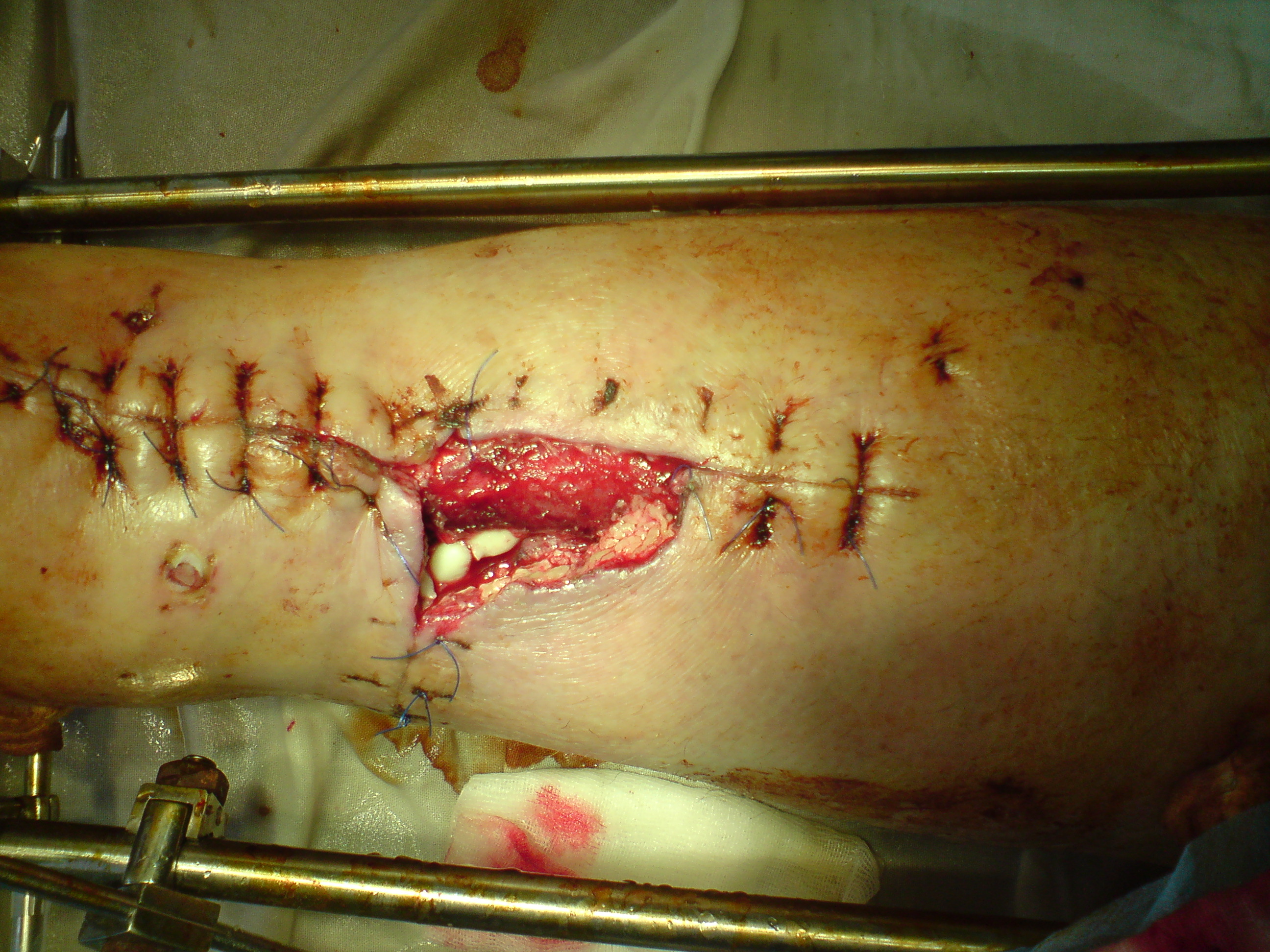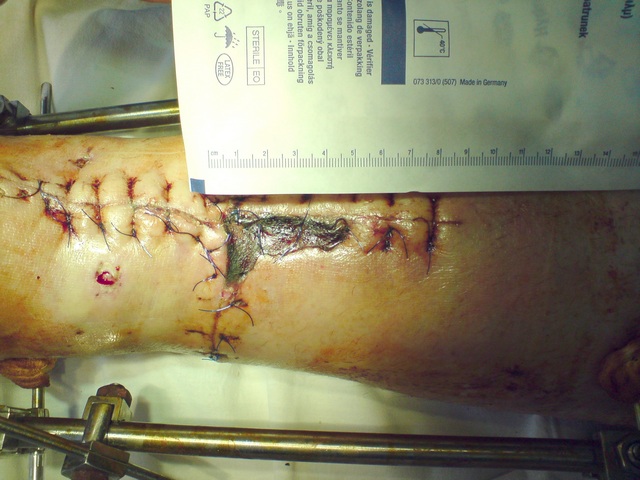 С хирургической стороны нет смысла спешить с максимальным закритием раны и кожной пластикой - важно дождаться максимальной элиминации возбудителя (достаточно агрессивного по классу возможности перехода из ситуации "открытый перелом" в "остеомиелит", возможно это даже "внутрибольничная инфекция") - тут наоборот сейчас важно адекватное дренирование раны