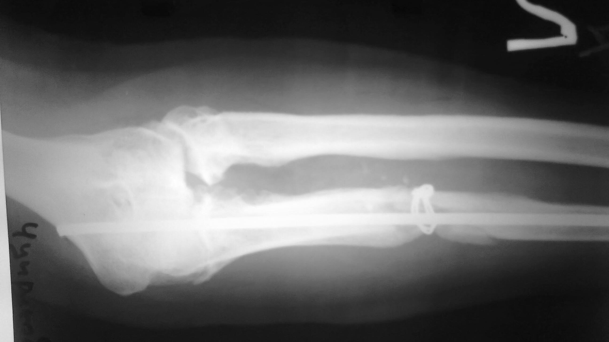 Вчера больной прооперирован - головку лучевой кости пришлось резцировать (сгибание было около 100 гр.и все бы ничего, но ось локтевой кости очень плохо выравнивалась ,сгибание после резекции увеличилось на 20 гр.) Снимок после резекции головки.