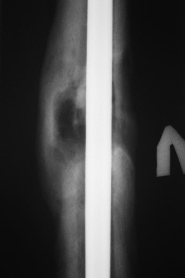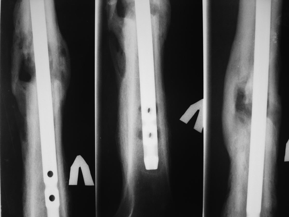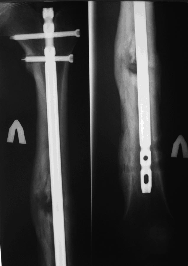 Уважаемые коллеги, представляют на обсуждение клинический случай!Пациент 26 лет, около года назад получил травму в результате ДТП. По поводу перелома диафиза бедренной кости выполнялся БИОС. Спустя 4-5 мес. пациент обратился с болями в нижней трети бедра (проекция дистальных блок. винтов). При RG выявлена их миграция, выполнено их удаление. Спустя еще 4-5 мес обратился с жалобами на припухлость в области дистального блокирования. В поликлинике сделали снимки и, с подозрением на остеомиелит, оправили в стационар. Сегодня: местно - без признаков инфекции. В области дистального блокирования припухлость плотно-эластичной консистенции. При пункции получить ничего не удалось. Лейкоциты 6,0; СОЭ - 22. СРБ-18. Температура в вечерние часы 37-37,2 Снимки представлены. Какова дальнейшая тактика? 1. ничего не делать 2. Удалить стержень + приливно-отливное дренирование. 3. Удалить стержень +_ АБ спейсеры или АБ стержень 4. Удалить стержень + приливно-отливное дренирование, а затем Цементные АБ импланты. < | >