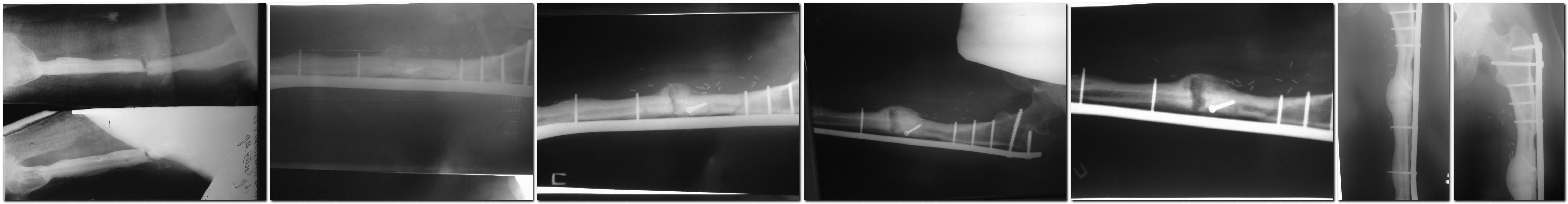 Доброго времени суток! Когда то (осень-зима, не могу найти свой пост :))подымал вопрос про тактику лечения данной пациентки (девочка 19 лет, остеосаркома бедра 2010 г, лечение - резекция бедренной кости с замещением дефекта васкуляризованным малоберцевым аутотрансплантатом, МОС длинной L-oбразной 95 градусной пластиной, через год удаление импланта (консолидация концов трансплантат-бедро на фоне миграции винтов). 2012 год -перелом малоберцевого трансплантата, синтез индивидуально изготовленной пластиной с угловой стабильностью. В последующем признаки резорбции в зоне перелома. Возникал вопрос про рецидив саркомы, нестабильность синтеза,и соответственно тактику ведения больной. Больная и родственники категорически отказывались от проведения биопсии. Тогда выбрал выжидательную тактику, лечение - курс пролиа (Деносумаб). Снимки в хронологичной последовательности, интервал 2-3 мес. На данный момент жалоб нет, полная функция.