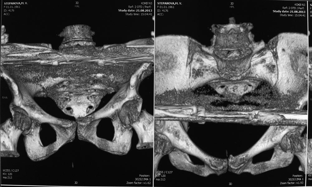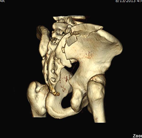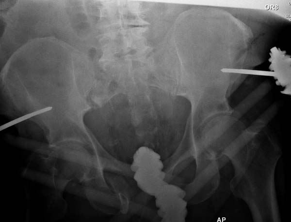 Двухстороннее повреждение крестца и травматическая ампутация бедра, где неопытной бригадой дежурантов установлен верхний наружный фиксатор для стабилизации. На третий день ревизия на более стабильный, и окончательная фиксация. Первые снимки после стабилизации таза, и другие, где показаны (параллельные) правильная установка на AIIS т.е на месте прикрепления прямой мышцы бедра. Ампутация закончена костно пластическим методом.