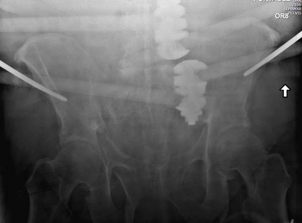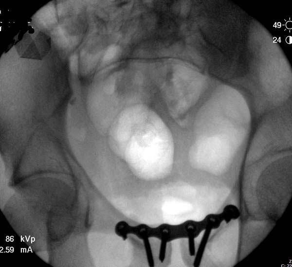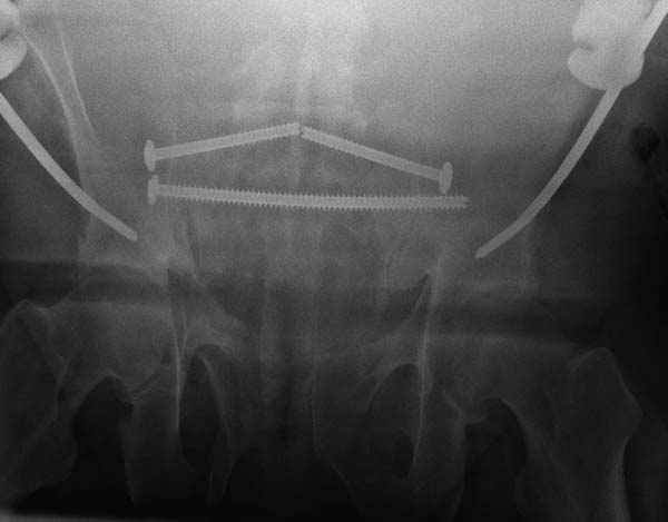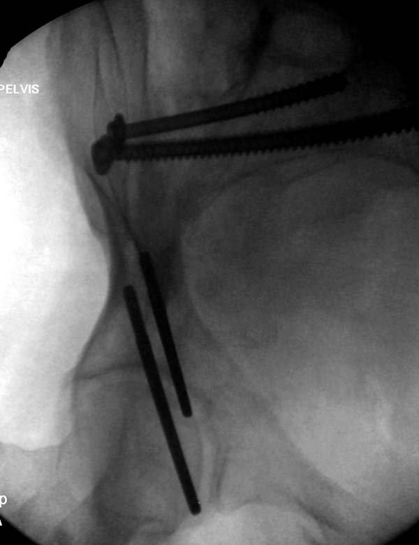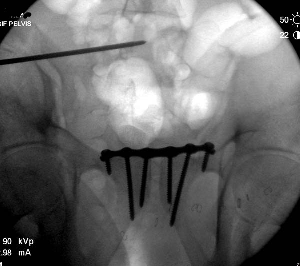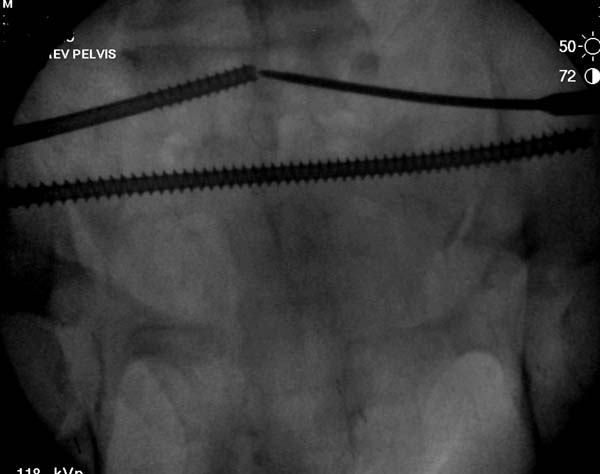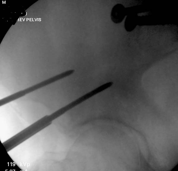О преимуществах более стабильной фиксации,которая легко осуществляется под рентгеном, говорили много раз. Слабость фиксации можно исправить за счет нескольких стержней, проведенных более вертикально в подздошной кости, или приближением стержней ближе к симфизу через AIIS.
