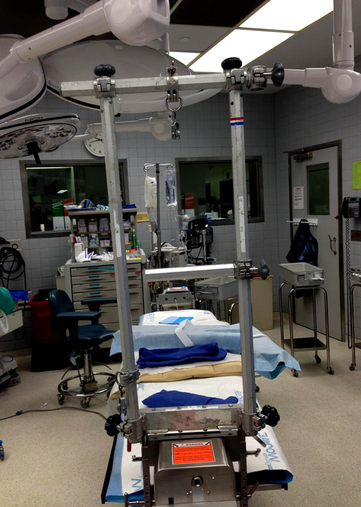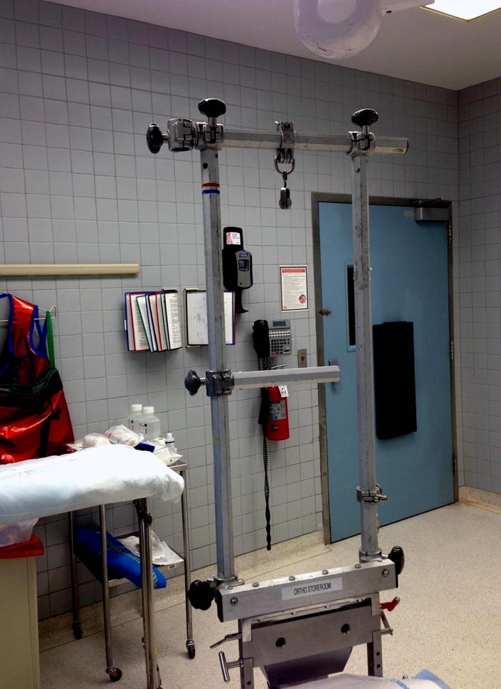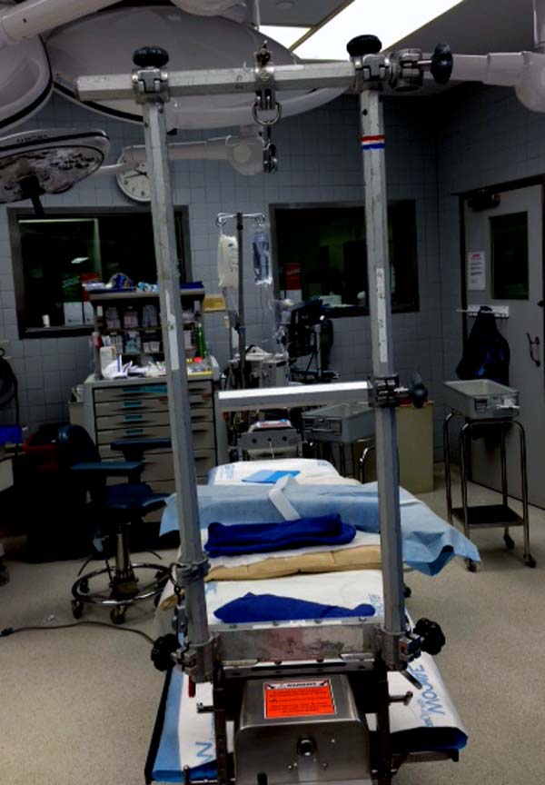 Техника репозиции вытяжением работает намного лучше, когда конечность в согнутом положении, потому что нейтрализируются абдоминальные мышцы. Вместо больших грузов, сгибание лучший прием для репозиции. А все остальные методы: фиксация половины таза к столу и опускание головной части вниз, создают хаос в операционной!
