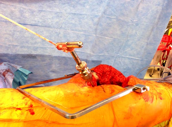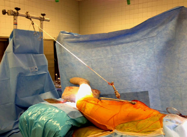 Здесь снимки, которые показывают направление стержня, а также идею репозиции вытяжением. На рентгенопроницаемых столах имеется возможность установить дополнительную раму, где по желанию можно увеличить или уменьшить высоту угла вытяжения. Для репозиции таза больной в положение на спине, стержень для вытяжения остается во время операции. Система подойдет для тракции головки бедра из вертлужной впадины, и для этого стерильная веревка и Synthes Universal Chuck with T-Handle.