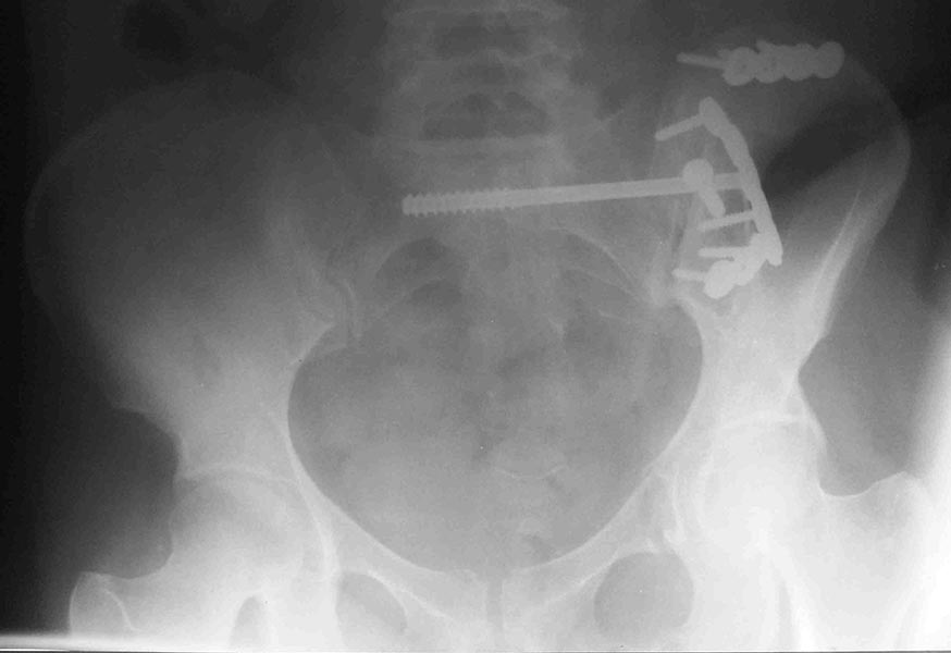 Перелом заднего отдела крыла подвдошной кости доказывает, что задние связочные элементы подвздошно- крестцового сочленения интактны, и такой перелом известен как “Сrescent fracture’. Переломы разделяется на 4 типа, и до фиксации надо хорошо изучить топографию перелома, иначе винт может попасть в линию перелома и не удержать фиксацию.
