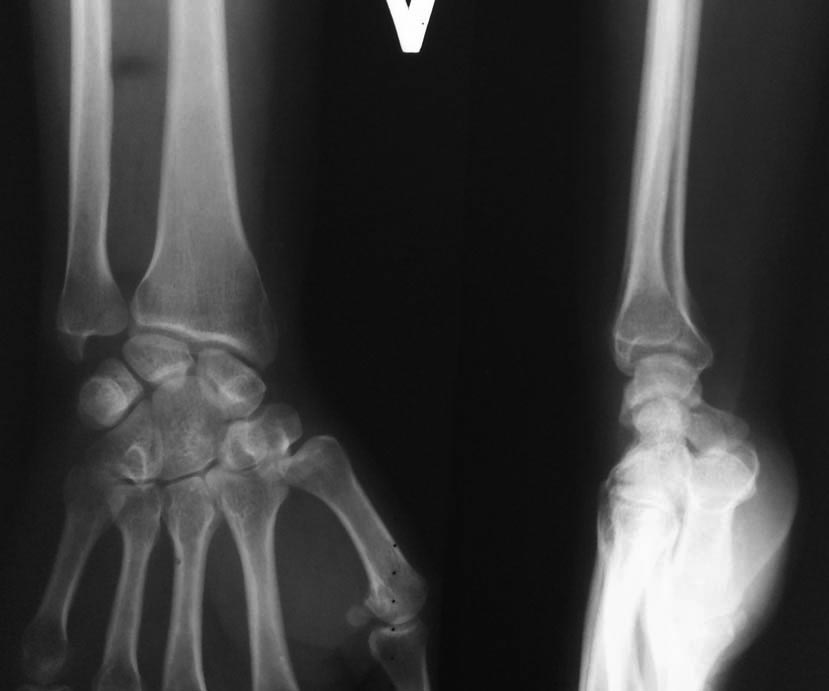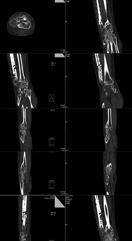 По простым снимкам (а по КТ еще лучше) видно, что суставная поверхность отклонена к тылу, кисть на подвывихе, есть внутрисуставная деформация. Укорочение локтевой кости только усилило проблемы, а тут еще и несращение...