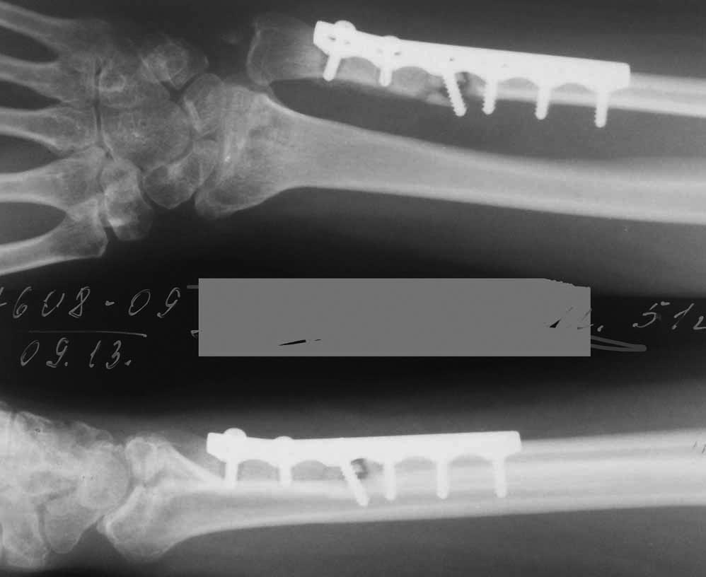 Обратилась пациентка, которой по поводу неправильно сросшегося перелома дистального эпиметафиза лучевой кости была выполнена корригирующая остеотомия локтевой кости. В феврале этого года пациентке, с ее слов и по данным выписки, была выполнена укорачивающая остеотомия локтевой кости по типу "русского замка". Основанием такого решения послужили жалобы больной на лучевую косорукость вследствие неправильно нелеченного перелома дистального эпиметафиза лучевой кости (давность около 3 месяцев). В настоящий момент беспокоят жалобы на сильные боли в области лучезапястного сустава, "щелчки" при движениях кистью и вращении предплечья. Пользоваться левой кистью по назначению не может. Послеоперационный рубец нормотрофический. Рана зажила первичным натяжением.