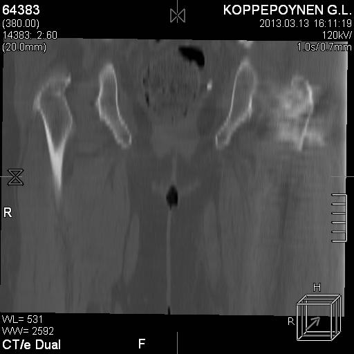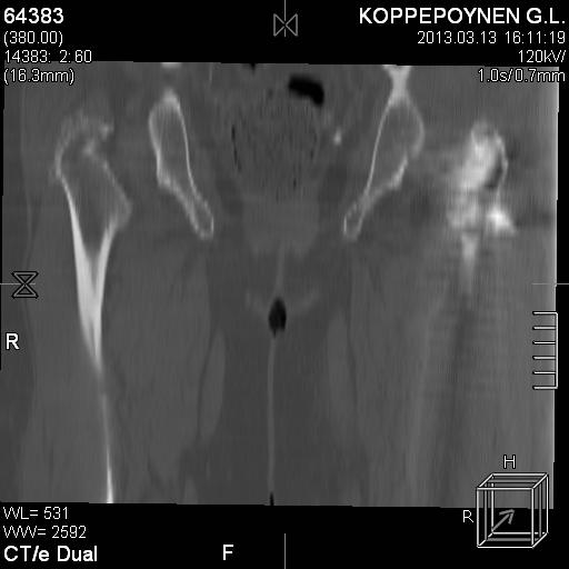 На первичных рентгенограммах признаки выраженного коксартроза, на кт (мне не видно, все не четко как то). Тактика: оценить степень заболевания сустава, были ли жалобы у пациентки ранее (до перелома) на этот сустав(наблюдается она у невролога, значит с большой долей вероятности жалобы были). Все взвеси, предложить протезирование. Это в теории.На практике, реостеосинтез РFn.