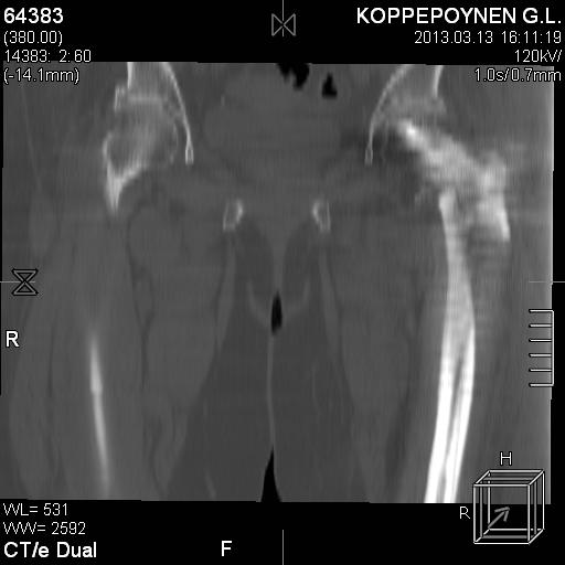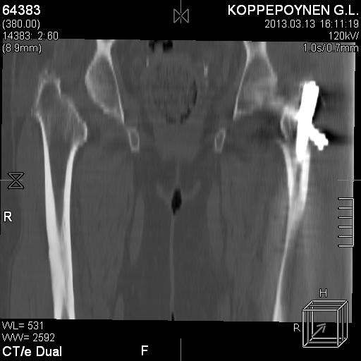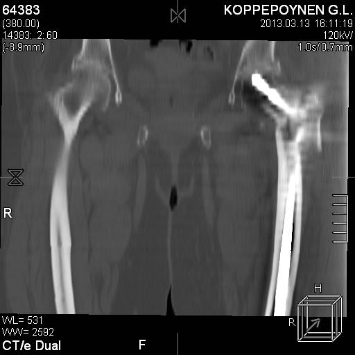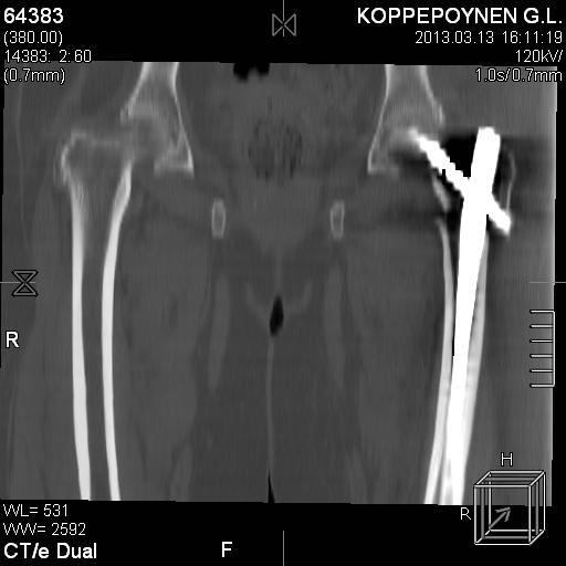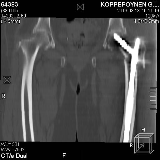 Пациентка, К., 74 лет. В марте 2013 г. упала, диагностирован многооскольчатый чрезподвертельный перелом левой бедренной кости со смещением отломков. 05.03.2013 выполнена закрытая репозиция, остеосинтез левой бедренной кости длинным бедренным гвоздем (ITST, Zimmer) со статическим блокированием отломков. Пациентка в течение 8 недель ходила при помощи ходунков с минимальной нагрузкой на оперированную нижнюю конечность. После выполнения рентгенографии отмечена тенденция к прорезыванию винта и смещение шейки бедренной кости латерально по оси винта (до стержня), нагрузка была ограничена еще на 8 недель. Через 8 недель постепенное градуированное повышение нагрузки до полной. В течение 1,5 месяцев ходила с полной нагрузкой на левую нижнюю конечность, водила автомобиль. Через 1,5 месяца стала отмечать боль в области левого коленного сустава (ранее выполнялось эндопротезирование). Данных за нестабильность компонентов не выявлено. Курсы НПВС по-началу купировали боль в области бедра, через 1 месяц стали малоэффективны. Пациентка наблюдается у невролога в связи с протрузией дисков на уровне пояснично-крестцового отдела позвоночника и периодическими обострениями остеохондороза. С диагностической целью была выполнена блокада бедренного нерва с левой стороны. Боль была полностью купирована, однако возобновилась после прекращения действия анестетика. 10.10.2013 г. пациентка выполнила рентгенографию левого тазобедренного сустава. Выявлен перелом металлофиксатора. Пациентка госпитализирована для лечения.Пациентка до травмы вела активный образ жизни, водила автомобиль. В настоящее время хочет избавиться от болевого синдрома, восстановить опороспособность левой нижней конечности, вернуться к своему обычному ритму жизни.Коллеги три основных вопроса:Какую тактику в данном случае предприняли бы Вы? Варианты удаления металлофиксатора? Чем выполнить реостеосинтез?С уважением, Ершов Дмитрий Сергеевич