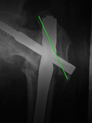 Про динамизацию забыли написать. Но проблема из без нее очевидна. Типичная ошибка с "диагональным" положением гвоздя. Т.е. латеральная точка введения и направление к медиальной стенке центрального отломка. Как он должен бы располагаться - зеленая линия на картинке. Соответственно, надо пересинтезировать аналогичным имплантатом, не повторив этой ошибки. Наверно, можно в шейку в передне-заднем направлении ввести 1-2 винта в проекции канала от lag screw.