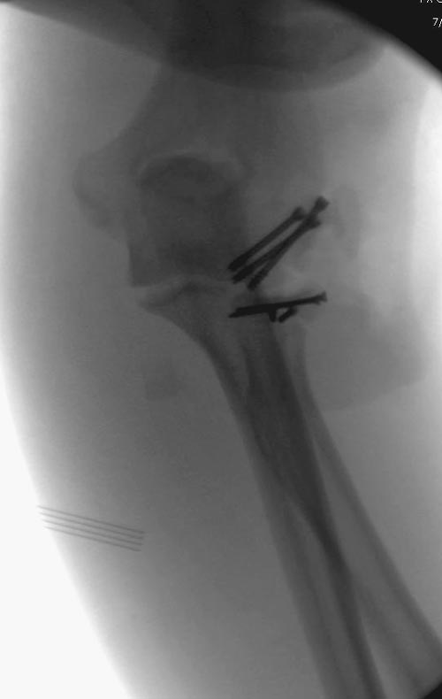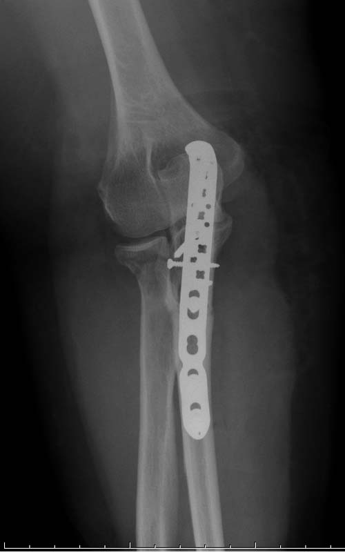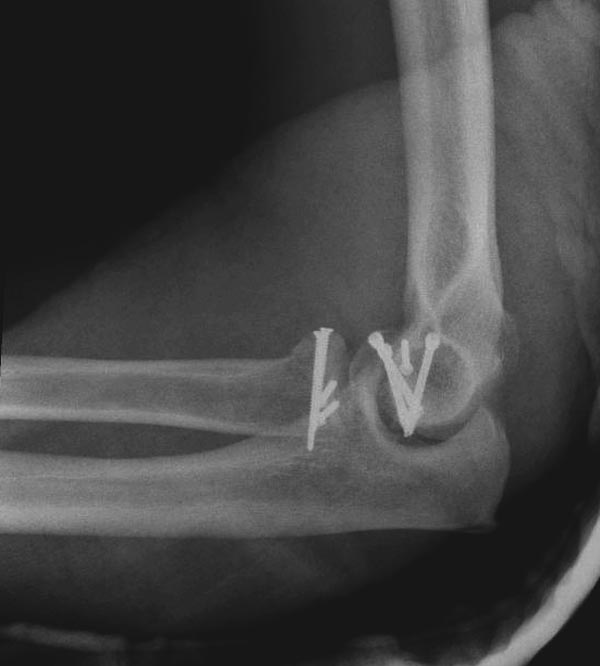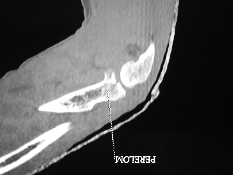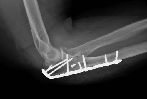 В первом случае перелом Монтеджи, где доперационно сделано оценка положения головки к остальным элементам под рентгеном. Учитывая правильность взаимотношении произведена фиксация только локтевого отростка, Второй случай, заменена на протез, и третий, кроме фиксации головки - реконструкция capitellum латерального мыщелка.
