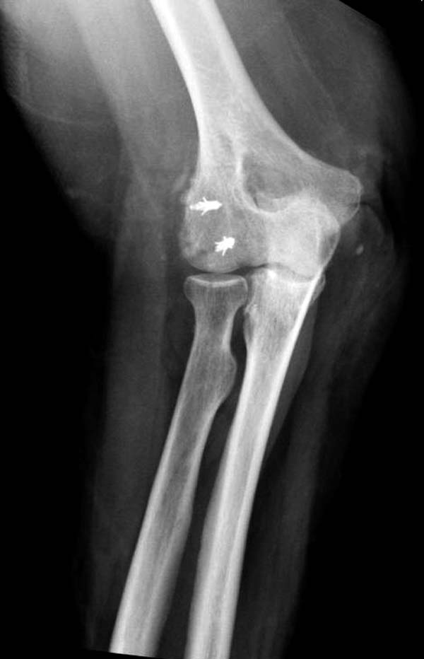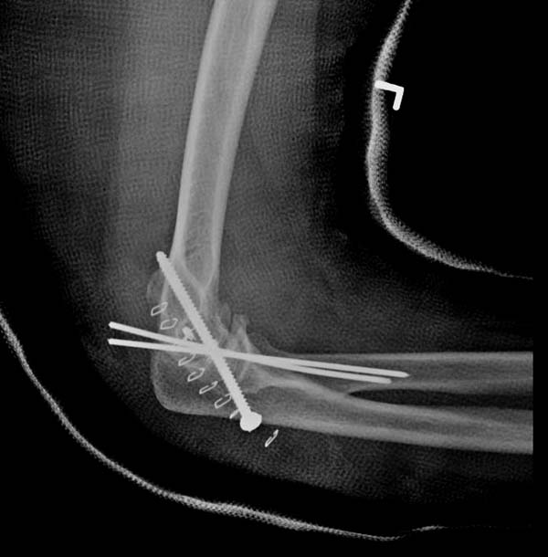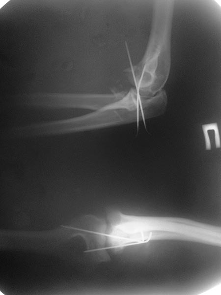 Иногда гипс не гарантировал стабильность и винт внутри гипса ломался. Удаление сломанного винта облегчаем, оставляя на пару мм длиннее с наружной стороны, Т.е винт через олекранон над наружный мыщелок, и никогда в трубку диафиза! Из малого разреза кончик сломанного винта удаляется без проблем.