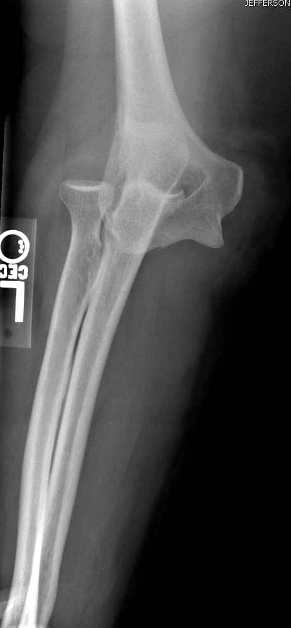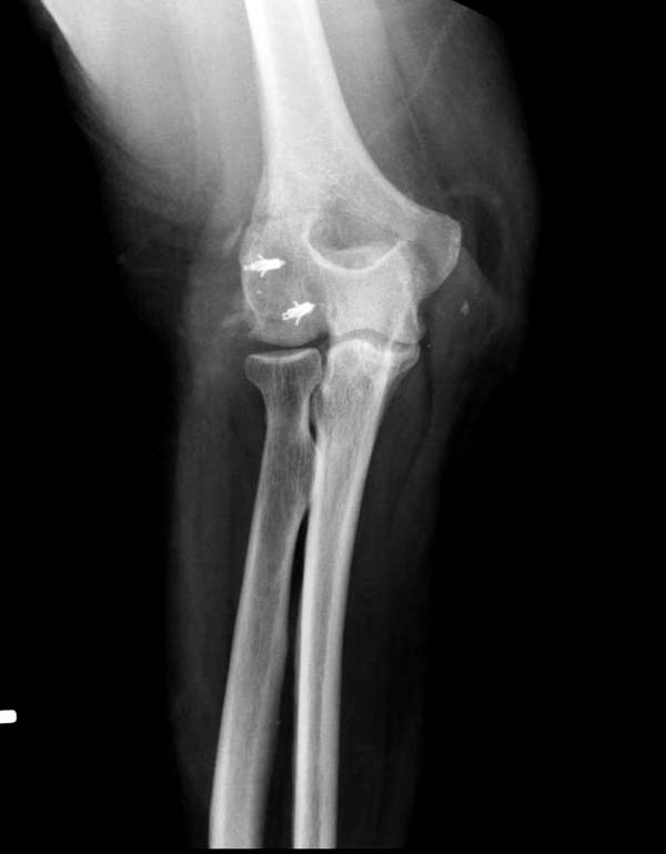 В данном случае имеется, так называемая, "ужасная триада" локтевого сустава, включающая перелом головки лучевой кости, перелом венечного отростка и вывих костей предплечья кзади, также в структуру травмы входит повреждение латерального коллатерального связочного комплекса и возможно передней порции медиальной коллатеральной связки. Лечение состоит из следующих этапов: фиксация венечного отростка( анкер или проволочная петля типа лассо), далее остеосинтез или протезирование головки лучевой кости ( КТ было бы желательно, фотографии не особо четкие), затем шов латерального коллатерального связочного комплекса. Если сохранится нестабильность, потребуется или шов передней порции медиальной коллатеральной связки с иммобилизацией верхней конечности аппаратом внешней фиксации (желательно с сохранением движений в локтевом суставе) или только аппарат(мнения расходятся). Аппарат 6 недель. Результаты лечения таких повреждений не очень хорошие.