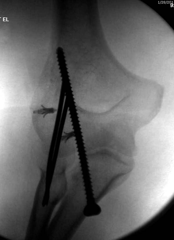 Несмотря на отрицательный отзыв, некоторые нестабильные вывихи лечим трансартикулярным методом. Тонкие спицы ломаются и имеют риск внутрисуставной инфекции. Винты 3.5 мм не выдерживают, а более толстые каннюлированные винты неплохо проявили себя. Неосторожность при установке приводила к поломке тонких guide wire внутри сустава. Лучшие кортикальные в 4.5 мм и гипс на три недели. Винт удаляется, затем разработка сустава.