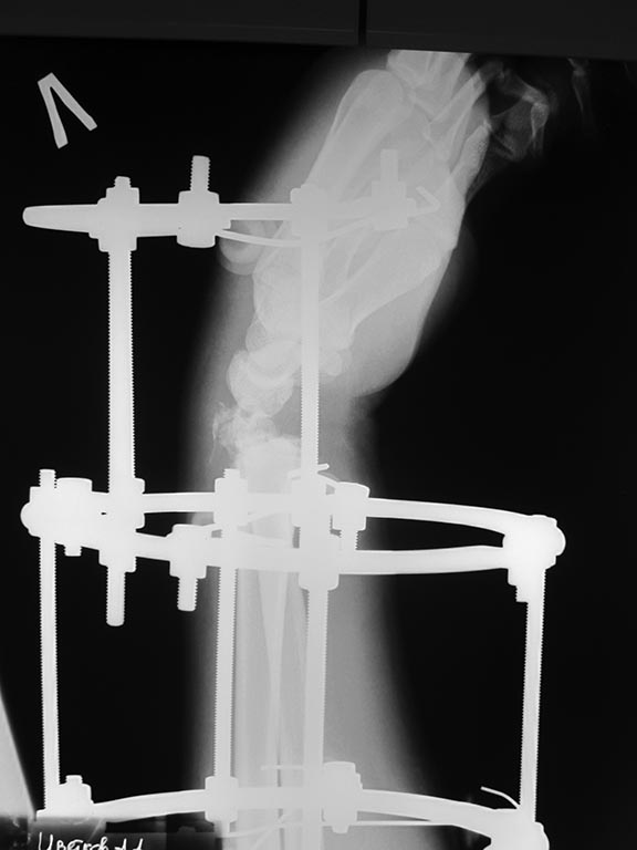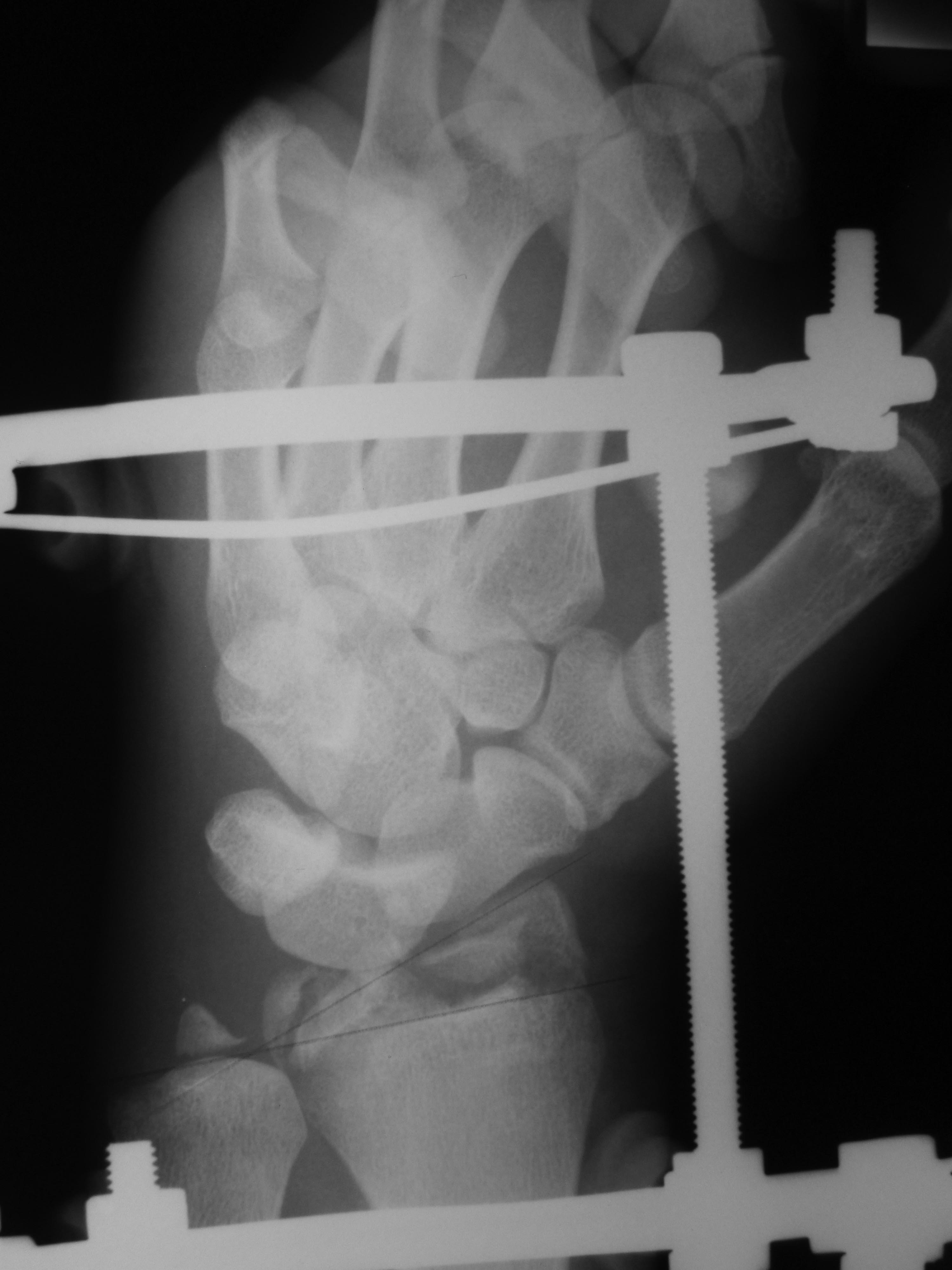 Здравствуйте! Кисть в подвывихе к тылу. Возможно стоит вставить в дистальное кольцо шарниры или вставки, для того, чтобы тракцию осуществлять под углом, т.е. в ладонную сторону. Пример аппарата во вложении, только тут тракция в другую сторону - к тылу, а вам надо в ладонную.