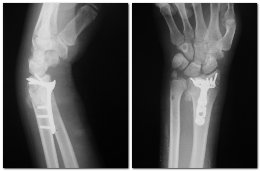 Доброго времени суток, глубокоуважаемые коллеги! Прошу помощи по лечению суставного перелома дистального метаэпифиза лучевой кости Пациент 22 лет. Травма в результате ДТП 14.11.13. Диагноз: Сочетанная травма. Тупая травма грудной клетки. Закрытый перелом 2, 3, 4 рёбер слева, 4, 5 справа. Ушиб лёгких. Закрытый оскольчатый перелом дистального метаэпифиза левой лучевой кости со смещением отломков, вывихом головки локтевой кости, нейропраксией срединного и локтевого нервов. Ушибленная рана головы. Первично обращался в другое больничное учреждение, где произведено ПХО,закрытая репозиция. От госпитализации отказался. Через 2 дня обратился за помощью по месту жительства. Госпитализирован. Левое предплечье резко отёчно. Выявлена клиника нейропатии срединного и локтевого нервов с чувствительными расстройствами. Произведена повторная закрытая репозиция, которая не увенчалась успехом.Наложен аппарат внешней фиксации. Подвывих кисти устранён. Вывих локтевой кости вправлен. Клиника нейропатии локтевого нерва купирована. На настоящий момент сохраняется гипостезия 1п левой кисти, отёк купируется.Ввиду молодого возраста пациента и оскольчатого характера перелома планируем вторым этапом произвести погружной остеосинтез. Прошу помощи с планированием остеосинтеза. Удастся ли стабилизировать перелом из ладонного доступа, или необходим и тыльный? Каким имплантатам отдать предпочтение?