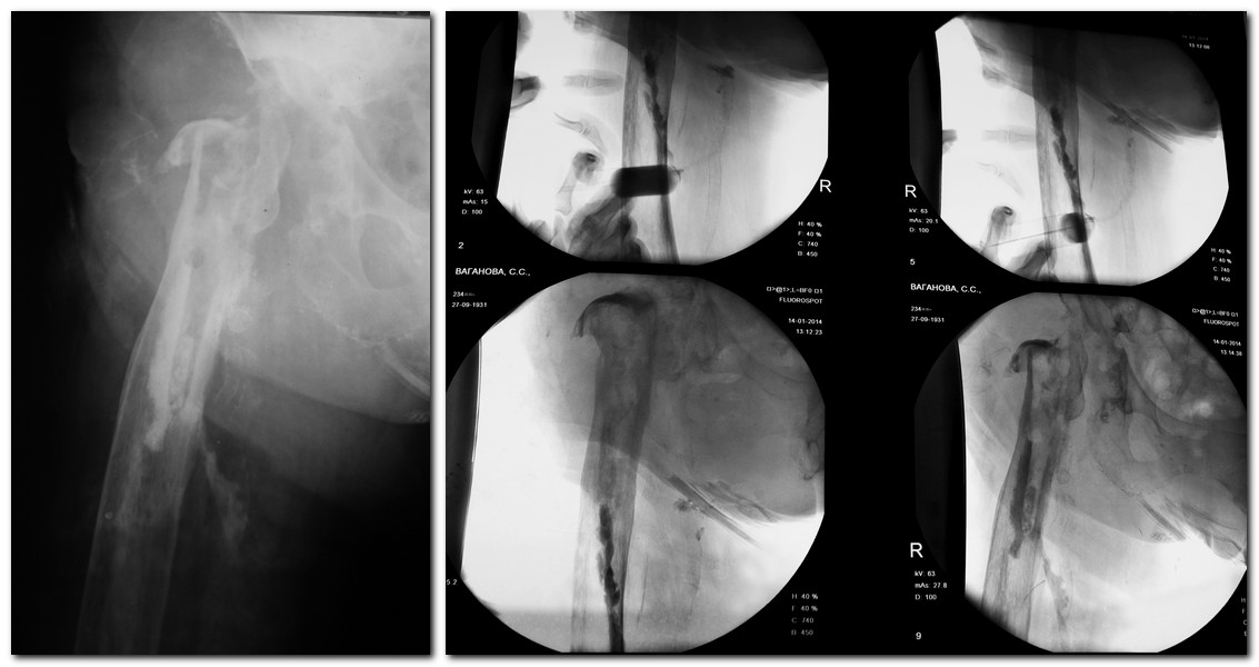 Уважаемые коллеги! Нужен совет по тактике дальнейшего лечения. Больная,83 лет. Поздняя глубокая парапротезная инфекция,нестабильность обоих компонентов. Свищи функционировали года 1,5. 1 в н/3 п/о раны, второй открылся около года по задней поверхности бедра на границе с/3 и н/3. Высевалась микст инфекция Г- и Г+. Мигрировал вертлужный компонент вверх. Не могли убрать долго протез по социальным делам. Убрали в начале декабря. У нас уже 3 месяца. Из системных антибиотиков прошлись по всему больничному набору: линкомицин, цефтриаксон, ципрофлоксацин, ванкомицин, целапинем, еще что-то там уже не помню. Последний посев из верхнего свища 9.01 дал скудный рост ацинетобактер, там какие-то 3 колонии. Отделяемое скудное, больше из нижнего свища, из свища вверху гораздо меньше, какое-то серозное, иногда с кровью. Местно промывал 2% р-ром лавасепта, менял на пронтосан. сейчас хочу попробовать диоксидин, так как не знаю, чем еще промывать. Сделал фистулографию на неделе, картинку прикрепляю. Свищ судя по ней сообщается с костью. Ну и остатки цемента в канале. Обсуждал с з/о, так как свищ не закрывается, открыться на диафизе, трепанационное окно сделать, удалить остатки цемента, может задренировать канал? Отмыть все. Думаю, что трепанированная кость не заживет если ее на место уложить, а дефект большой будет. Ну и так как больная ходит у нас в ходунках, боюсь, это может привести к перелому. А не ходить ей нельзя, да она и не будет сидеть, довольно активная пациентка, в прошлом году только вышла на пенсию, профессор в каком то институте. Как то так. Подскажите по дальнейшей тактике, если можно. Эластичных ревизионных разверток для бедра нет. Инструментария с длинной ручкой для канала нет.