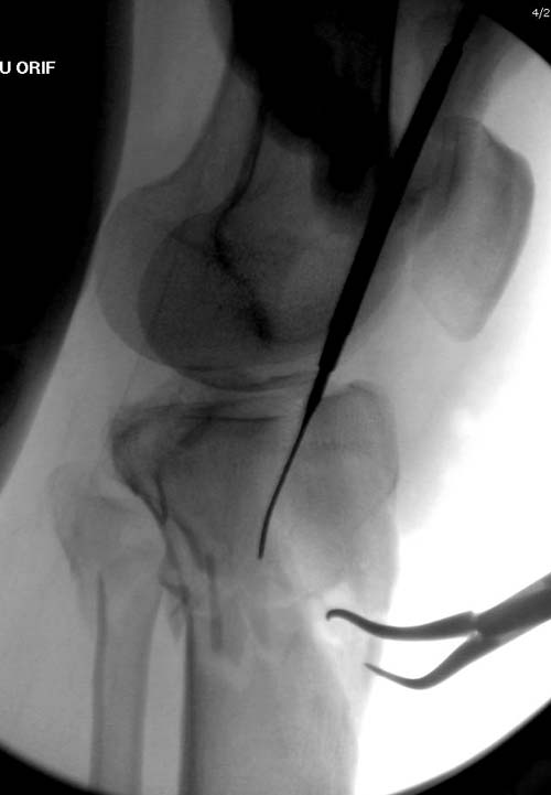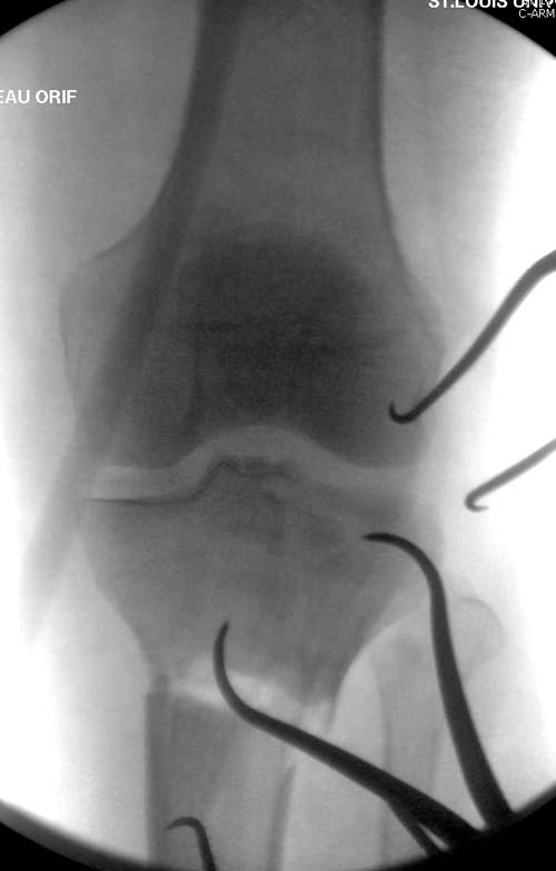 Вытяжение или наружный фиксатор “бедро-голень в виде дельты”. Фиксатор дает свободу, и если условия позволяют, можно отпускать домой. Но главное - надо ожидать проявления “wrinkle sign”! После дистракции можно делать КТ исследование, иначе нестабильные фрагменты искажают данные. Доступ делается по топографии расположения фрагментов, а 3Д картина лучше покажет расположение смещенных мыщелков.
