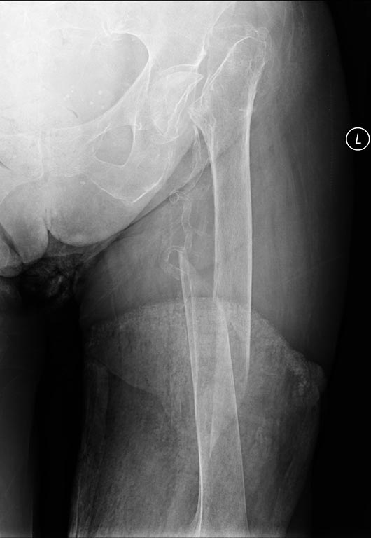 Женщина 87 лет. В 2006 году перелом шейки бедра слева, от операции тогда воздержалась. Последние 7 лет не ходит, со слов родственников передвижения иногда на коляске. 3 недели назал упала с кровати и сломала диафиз того же бедра. Объективно: истощена, вес 45 кг, пролежень (пока поверхностный)ягодичной области. Продуктивному контакту трудно доступна в т.ч. из-за глухоты. вторая нога с выраженным вальгусом в коленном суставе, движения сохранены.