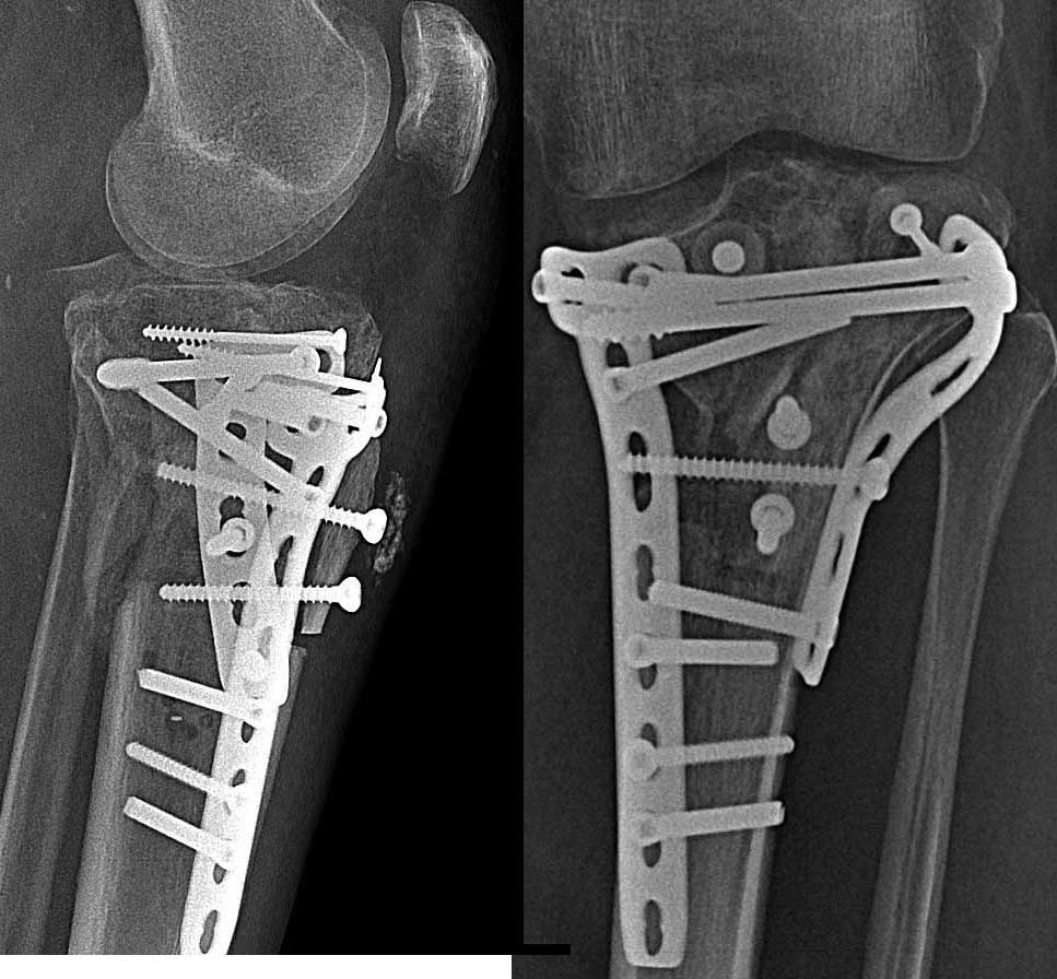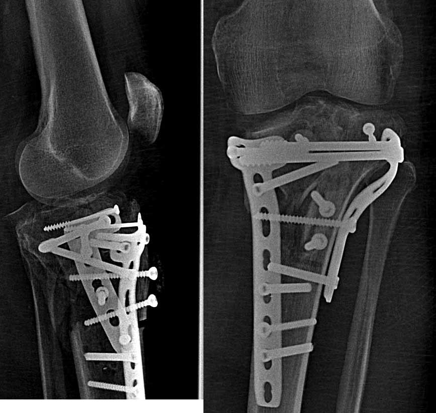 Резюме: сначала восстановите анатомию костных структур. Возможно ли? - не на 100%, так как есть невосполнимые потери собственно суставной поверхности. Метафизарные дефекты требуют костной пластики больше с точки зрения биологической поддержки, чем механической. Метафиз после удаления пластин выглядит "измученным" и не очень здоровым.