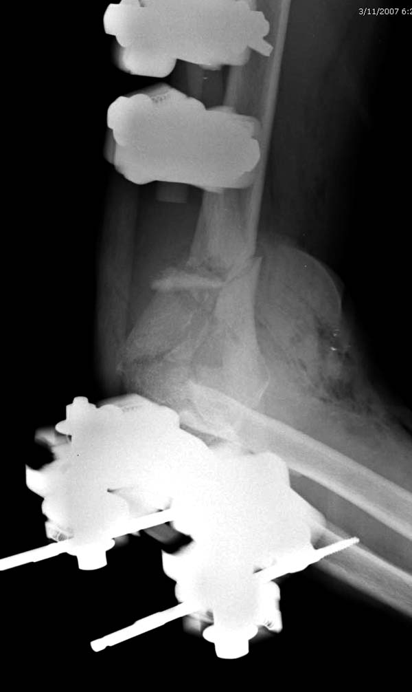 Здесь открытый перелом, временный наружный фиксатор и окончательная фиксация пластинами. Второй случай фиксация без остеотомии отростка пластинами Biomet-DePuy...