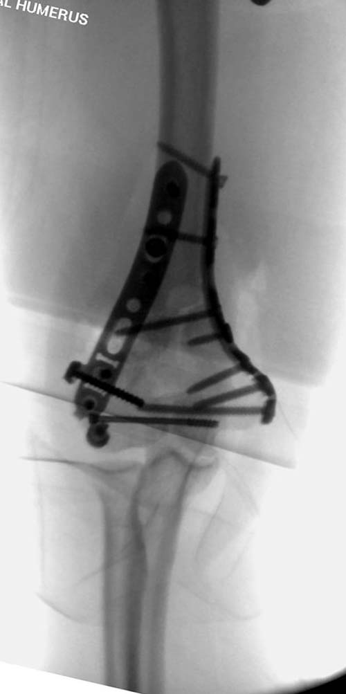 Если удастся репонировать закрыто сустав, тогда доступ к задней поверхности плеча можно достичь с двух сторон трицепса: медиального и латерального. Для фиксации можно применить 90 градусные пластины или Acumed key stone концепт с двух сторон.