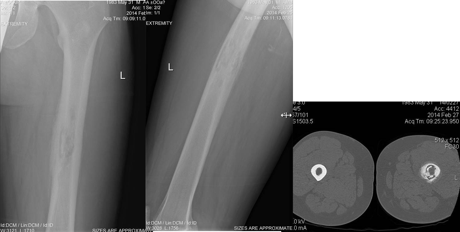 На рентгенограммах картина гематогенного остеомиелита с двумя, как минимум, формирующимися секвестрами. В настоящее время у пациента стадия нестойкой ремиссии. Я бы рекомендовал выполнить фиксацию бедра гипосовой повязкой (ортезом)с рентгенологическим контролем через 2 месяца, охранительный режим минимум на 1 год. При обострении - хирургическая обработка гнойного очага с удалением секвестров, пластикой остеозамещающими препаратами.