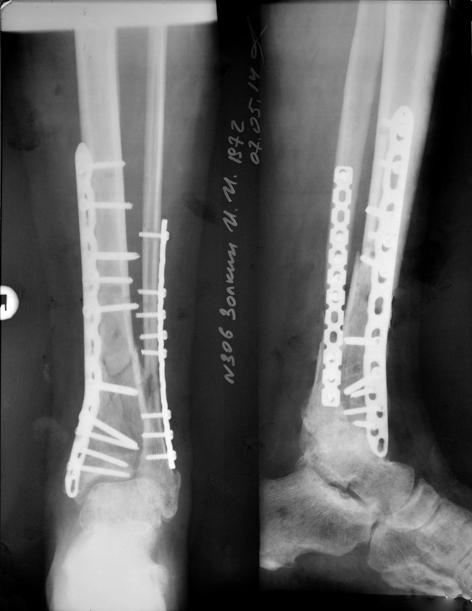 Хотелось бы узнать сроки после травмы и операции, увидеть исходные снимки. И голеностопный сустав увидеть из любопытства - нет ли там перелома наружной лодыжки?