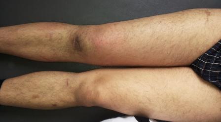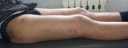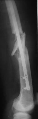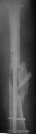 Уважаемые коллеги, наконец пациент явился на повторный осмотр, через два с половиной месяца после операции. Был рекомендован постельный режим в течение одного месяца, после контрольная Р-графия и потом решить, но со слов б-ного постельный режим 10 дней, ходьба при помощи костылей и палочки еще дней 20, и уже более полутора месяцев ходит без палочек, самостоятельно, с полной нагрузкой. При осмотре ось бедра правильная, активно поднимает ногу, укорочения нет, пальпаторно безболезненный, амплитуда движений в коленном суставе около 80гр.: 80/0/5. (якобы коленный сустав не разрабатывал из-за боязни боли). Рекомендована активная разработка движений. Выложил Р-снимки и фото. С уважением Абдурашид.